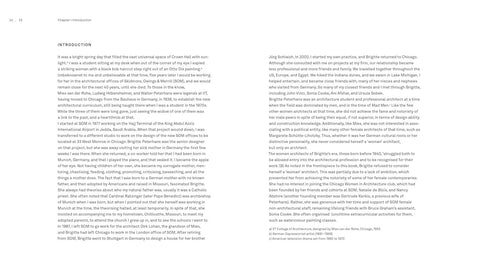 Born in a small village in Germany, Brigitte Peterhans managed to come to America to study with Mies van der Rohe at the Illinois Institute of Technology in Chicago, and then to work with Bruce Graham at Skidmore, Owings & Merrill. Her work during this time reflected the mid-century modernism of Mies and SOM. Later in her career, both towards the end of her time at SOM and then on her own after retiring from SOM, she developed her own individual style.