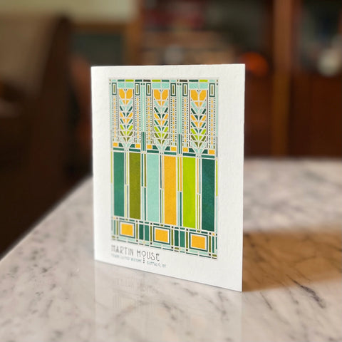 A2 size greeting card printed on 100lb archival natural color paper. Includes an envelope and cellophane sleeve. Abstract artwork of a beautiful stained glass windows at The Robie House, Dana Thomas House, and Martin House by architect Frank Lloyd Wright.
